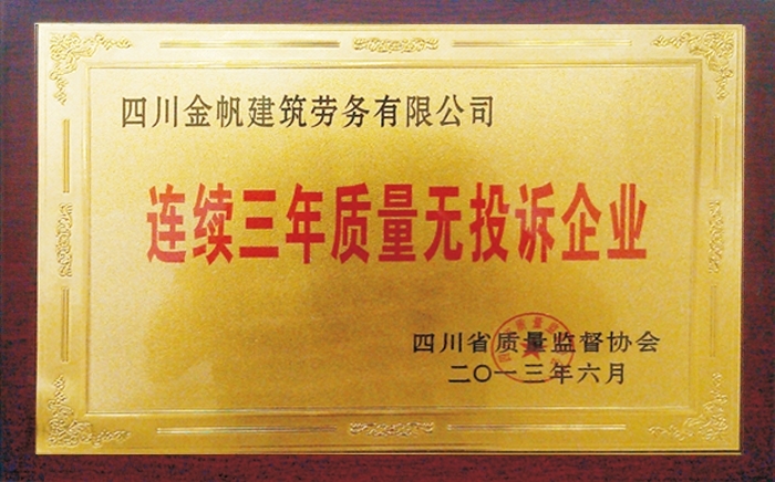 金帆連續(xù)三年質(zhì)量無投訴企業(yè)